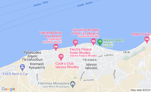 Luxusný rezort sa nachádza v pokojnej oblasti priamo pri krásnej pláži s krištáľovo čistým morom, iba 8 km od hlavného mesta Rodos.
